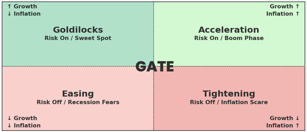 GATE is our proprietary model that nowcasts the market environment into one of four market regimes: Goldilocks, Acceleration, Tightening, Easing, based on two primary economic indicators: growth and inflation. The regime determines whether the market environment favors risk-taking or caution and the sectors that historically outperform.