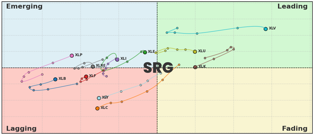 SRG is a powerful visualization tool for tracking relative strength trends, allowing you to compare sectors to the S&P 500 benchmark and to each other, making it easy to identify market leaders and laggards. Each sector is classified into one of four quadrants: Emerging, Leading, Fading, Lagging, reflecting the phases of a relative trend and revealing sector rotation patterns.